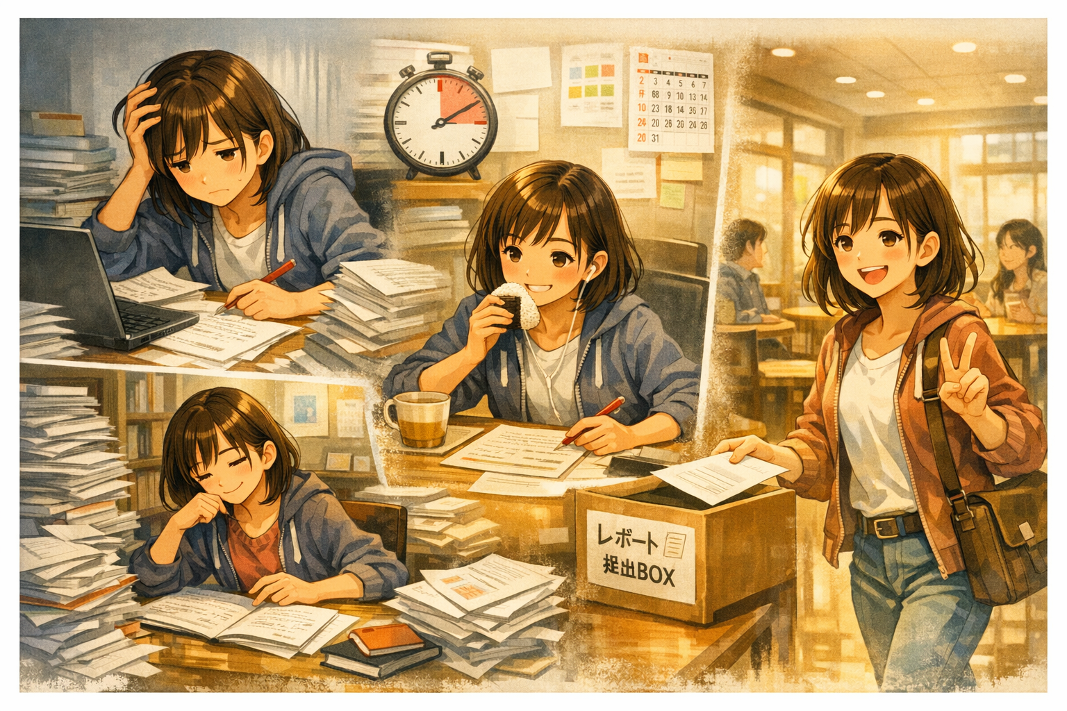 焦らなくて大丈夫です。まずは 今日どこまでやるか を小さく決めること。それがまだ苦しいなら、一人で抱え込まずに、支えてくれる人やサービスを早めに頼ること。その順番で整えていけば、レポートのしんどさは少しずつ軽くできます。